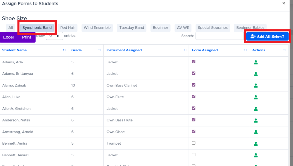 - In the popup window, select individual students or use “Add All Students Below” to assign the form to all students in that group.