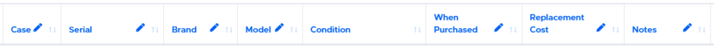 There are several columns which show a Pencil Icon including Case, Serial, Brand, Model, When Purchased, Replacement Cost, and Notes