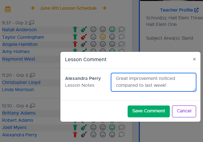 - All of these historical lesson remarks can be viewed on the Student Details page. You can click the student’s name from your dashboard to go right to those details.