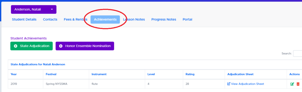 From here, you can click ‘State Adjudication’ or ‘Honor Ensemble Nomination’ and enter details about the student’s achievement.