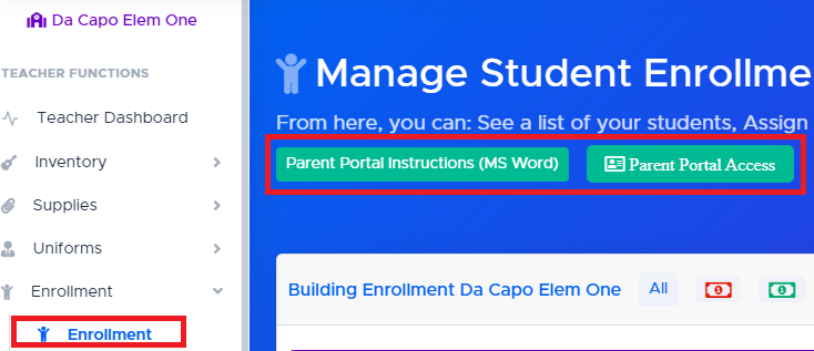 Teacher Side of the program: Enrollment –> Enrollment. Click the two teal links near the top of the page to provide parents instructions on how to register and for labels which include the ID Number and Access Code. (Hint: If you want to only print out labels for flutes, search for flute – then click the Parent Portal Access teal button.)