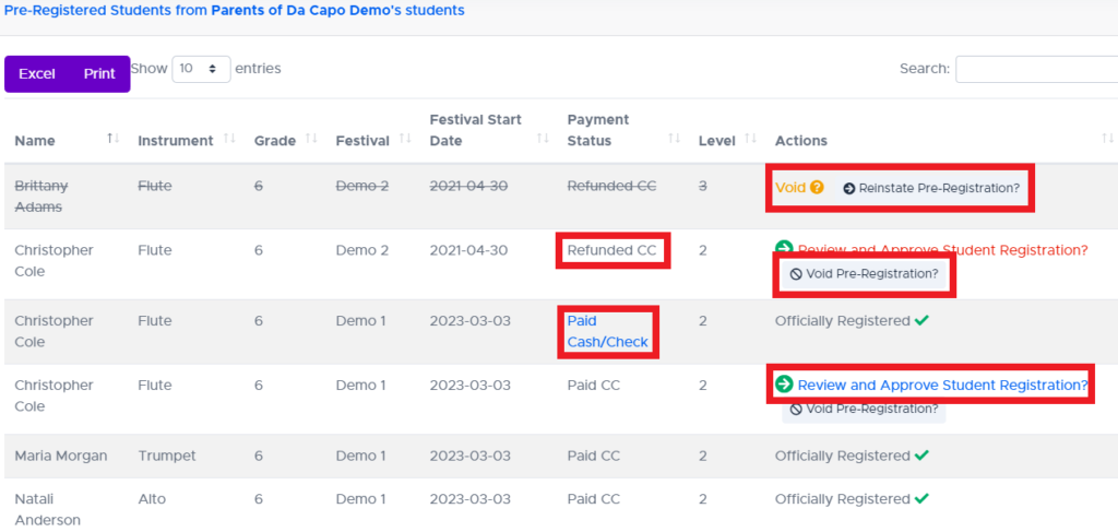 - Void a pre-registration. This will show the parent that the Pre-Registration has been cancelled. No information will be sent to Da Capo Music Festivals.