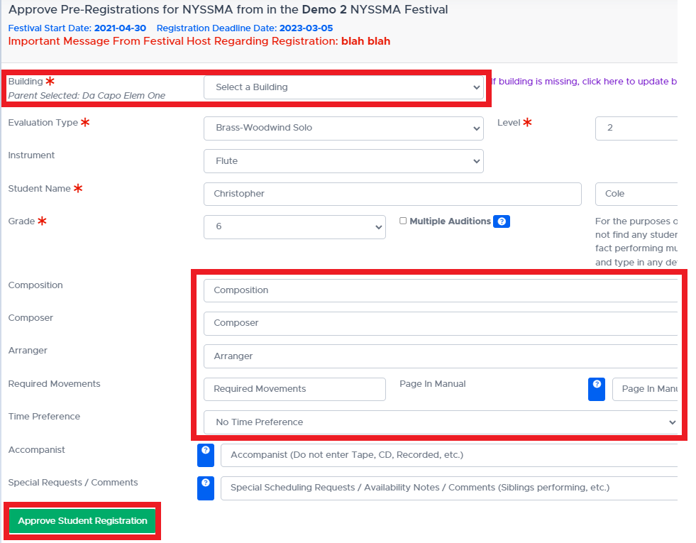 It is important for teachers to review the accuracy of all information before the student is officially registered in the Da Capo Music Festivals Registration System.