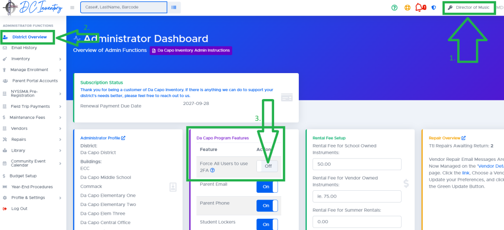 - School District Leaders have the ability to enforce this policy on their “Director (Chairperson)” Dashboard. Turning this option on will force all users in your school district to enable this authentication method. To enable the policy which forces all users to activate 2FA in your district, please follow these three steps: