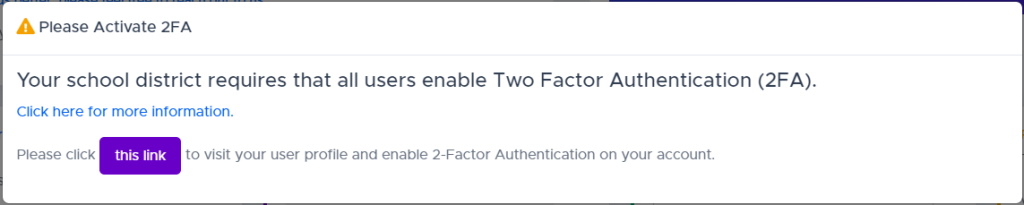 After the 2FA requirement is enabled, users will not be able to access any part of the program until 2FA has been activated. They will see a popup resembling the one below, directing them to navigate to their profile page to enable 2FA.