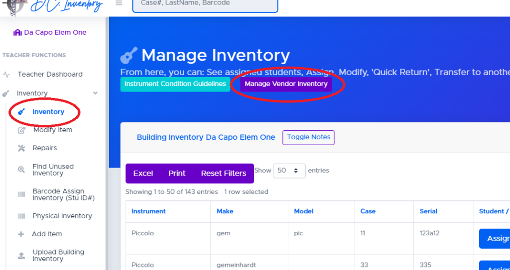 If your building has at least one ‘vendor owned’ instrument, you will see a ‘Manage Vendor Inventory’ button at the top of your inventory page.